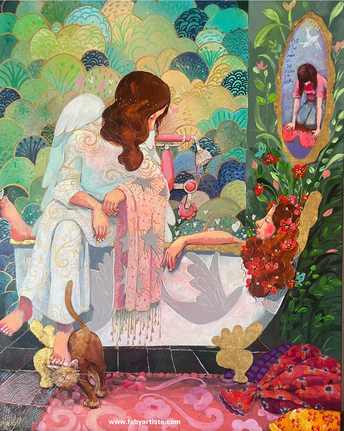 Le bain de l'âme C’est l’âme à genou, que tout le corps se lave. Informations format 92 x 73cm Acrylique et technique sur toile de lin Prix : 2480 €